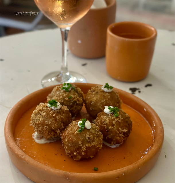 O arancini de cogumelos (R$55) abre o apetite trazendo a crocância do bolinho de risoto com a profundidade terrosa dos fungos. O rosé de estilo mais seco feito com a uva Grenache limpa a untuosidade da fritura do arancini, enquanto as notas de frutas vermelhas frescas do vinho contrastam bem com o sabor intenso dos cogumelos.