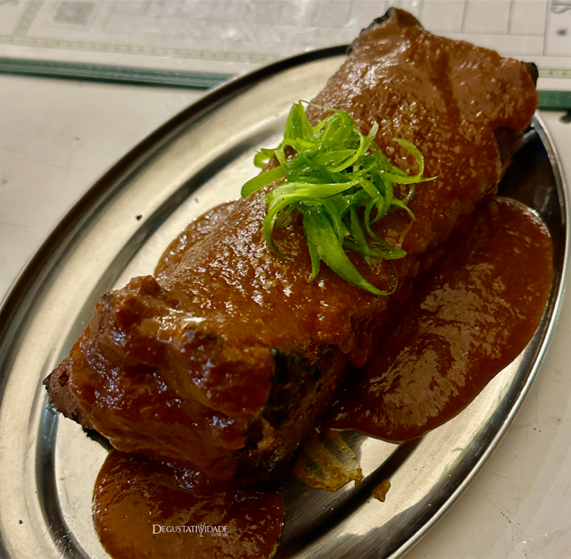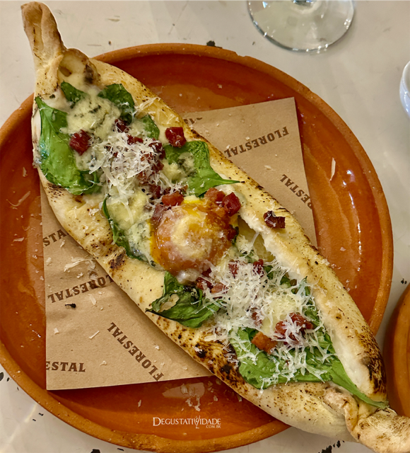 Adorei a pidé de espinafre (R$60) — uma versão da “pizza turca” — que apresenta em seu recheio várias camadas de sabor, combinando a força do queijo gorgonzola, a crocância do bacon e a cremosidade da gema curada. O rosé entra aqui como um pacificador: a acidez do vinho corta a gordura da gema e do bacon, enquanto o leve dulçor da fruta do vinho equilibra o salgado do queijo azul.